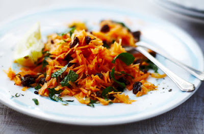 Soak the raisins in the orange juice for 10-15 minutes to plump up. Grate the carrots on the coarse side of the grater and put into a large bowl. Add the orange zest, plumped up raisins and juice, spices and vinegar.