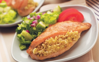 Make a hole at the back of the chicken breast and stuff in the farika mixture. Cook for a further ten minutes in an oven and serve hot.