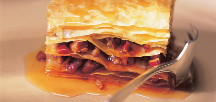 5. Place 5 sheets at the bottom of the pan, brushing with butter between each sheet. Sprinkle with about 250 ml (1 cup) of pecans. Cover with 3 more phyllo sheets brushed with butter. Sprinkle again with pecans. Continue to alternate layers of dough and pecans with the remaining ingredients.