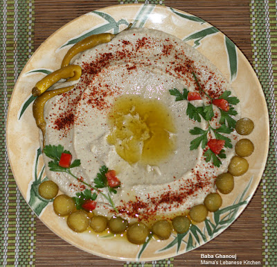 Baba Ghanouj is made by mashing roasted eggplants with Tahini paste, some garlic, and a bit of white vinegar to help lighten the color. It is served as a cold appetizer dip along with pita bread and some salted Lebanese pickles such as cucumbers, chili peppers and turnips.