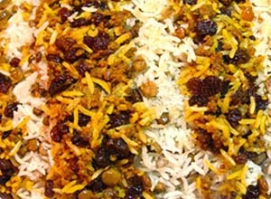 Wash raisins and dates. Pour 1/2 cup of water and some oil in the non-stick pot. Pour in half of the rice. Follow with meat, lentil, raisins, dates and raisins. Then add in remainder of rice. Cook over low heat for about 20 minutes. Dissolve saffron in 1/3 cup of hot water and pour over the rice. Mix well before serving.